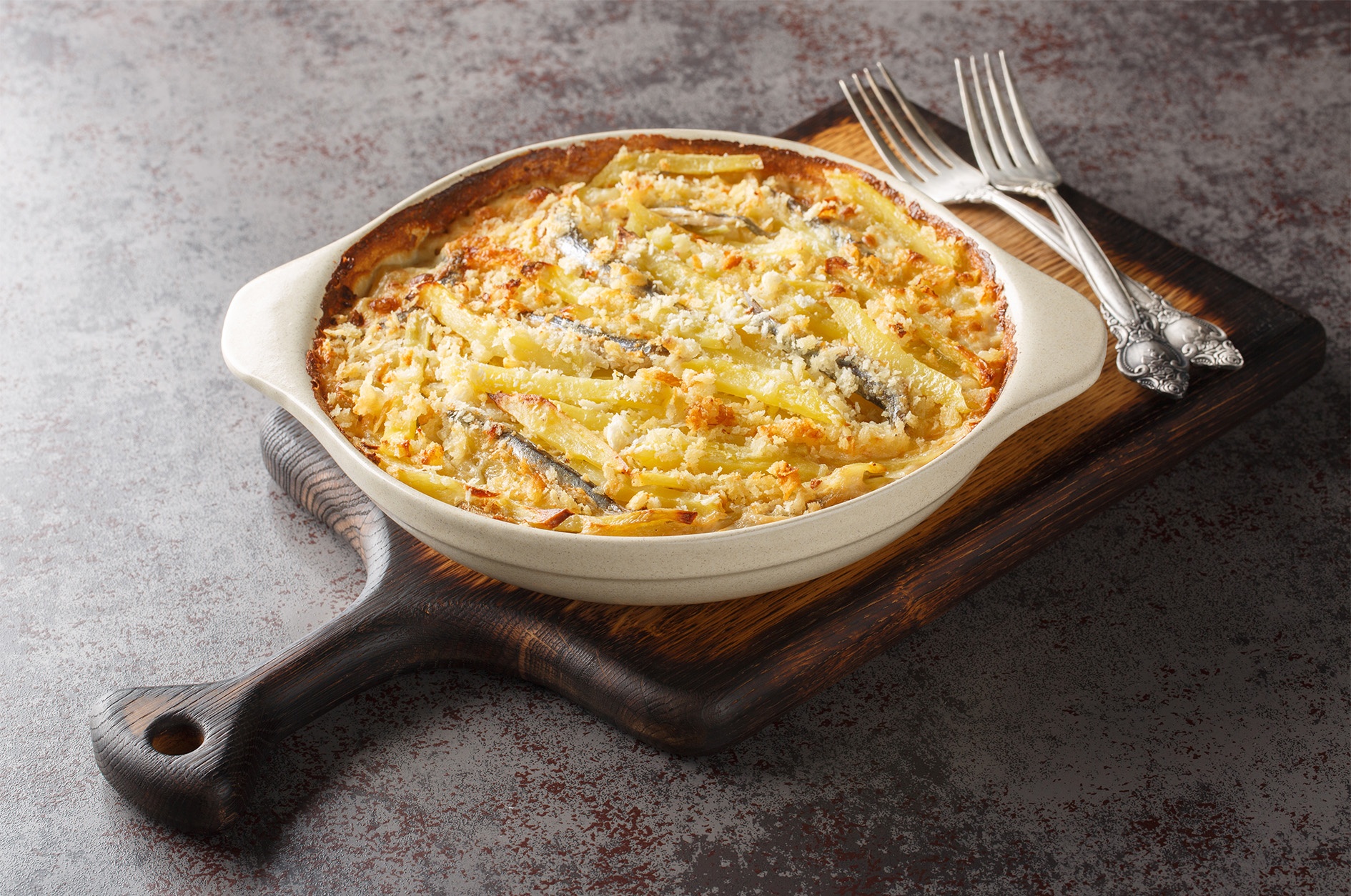 Smörj en ugnsform och varva hälften av potatisen i botten.